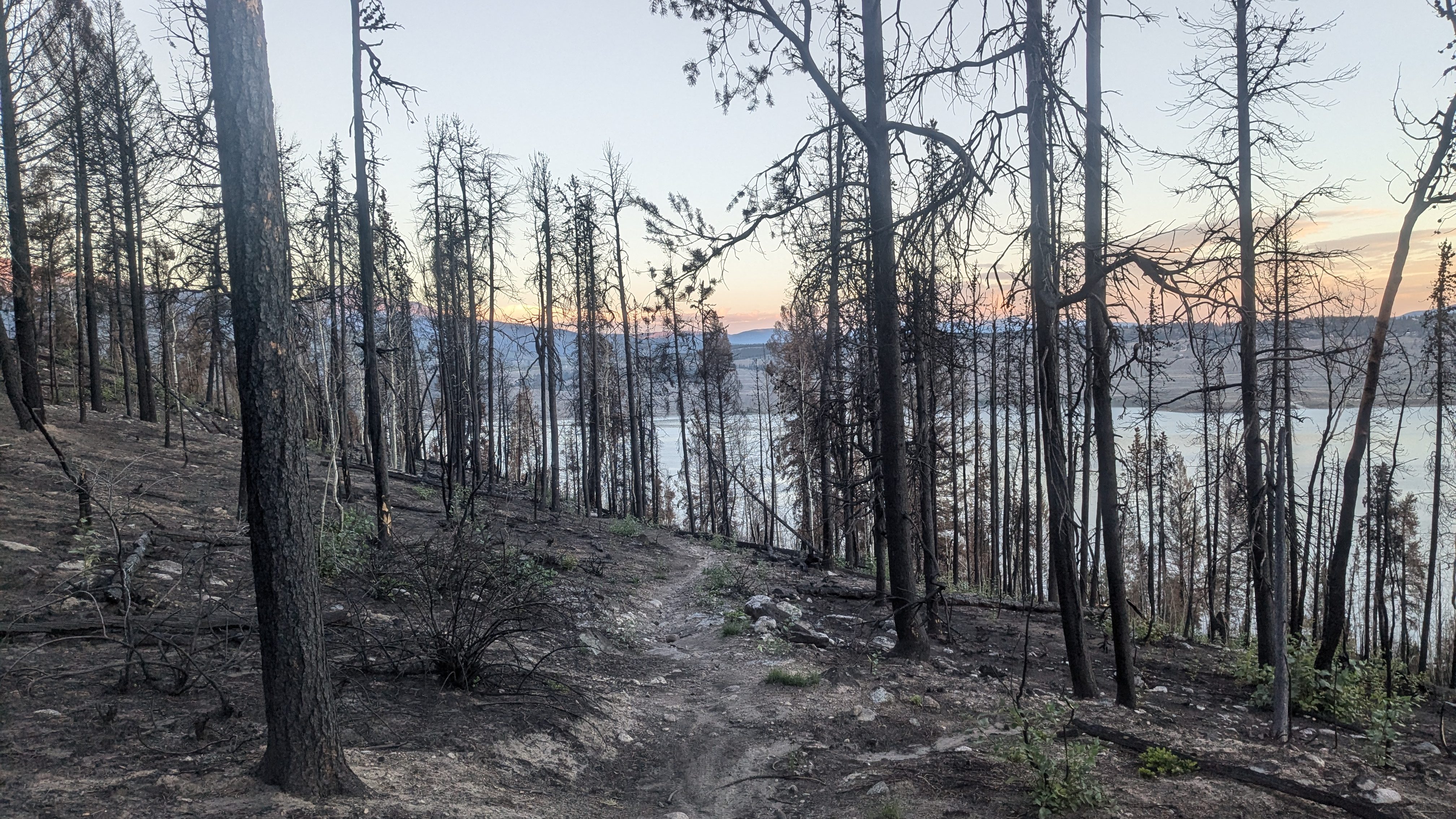 I began hiking shortly after first light. The trail followed the lakeshore, and the view of the still water below was enchanting in the early morning light. I reached the junction of the Collegiate East and West and hiked into a brand-new burn area from the Interlaken Fire earlier in the summer. Even though the freshly charred landscape was upsetting to see, the soft, ash-covered path was a welcome change for my sore feet. They felt achy and bruised after hiking over rocky passes on the Collegiate West the day before.