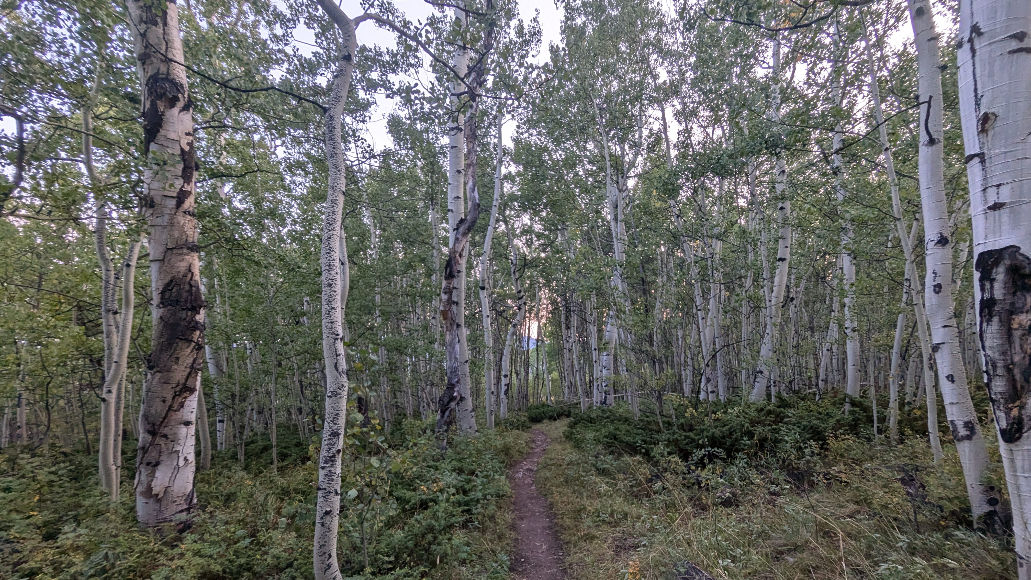 Fortunately, the rest of the day was a great improvement. After a hot meal and a nice long break under the awning at the general store, I continued hiking. Within half an hour, the sun came out! As I walked, I checked the elevation profile and was relieved to see the rest of the day was mostly a gradual uphill. My sore shins and knees would get a chance to recover. Best of all, the trail began winding through stands of towering aspen trees, which were simply magical to walk through during the golden hour before sunset.
