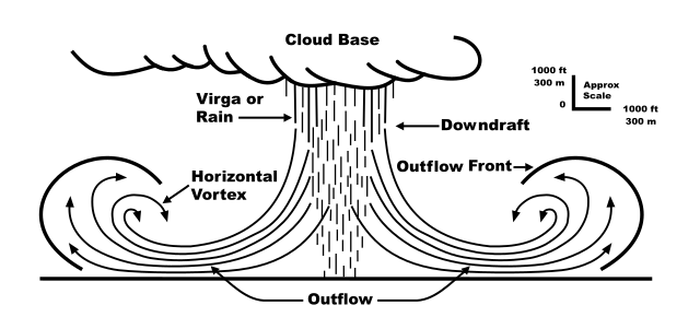 According to the National Weather Service, a microburst is a powerful downward draft of air under 2.5 miles across. They can produce winds up to 150 miles per hour and cause damage comparable to tornadoes.