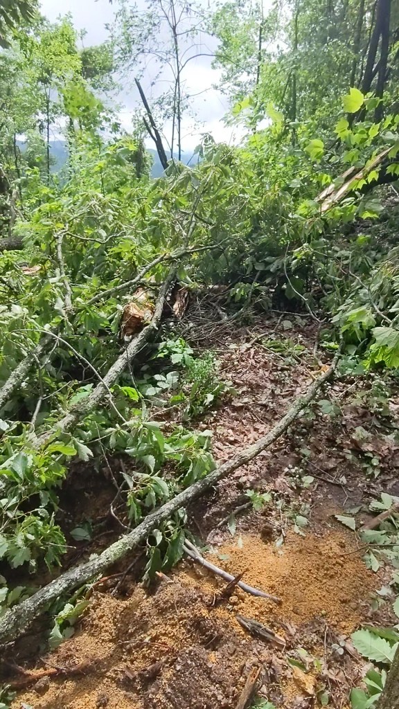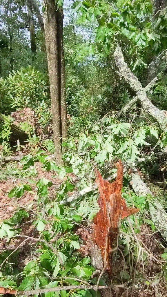 Three days after the storm, I met a trail maintainer hiking along the AT near Watauga Lake. Coincidentally, this trail maintainer and his crew spent the previous day clearing the trail between Dennis Cove Road and Moreland Gap Shelter. He took out his phone to show me photos of his crew standing in front of the same blowdown swath I saw! The trail maintainer speculated that the swath may have resulted from a microburst rather than a tornado.