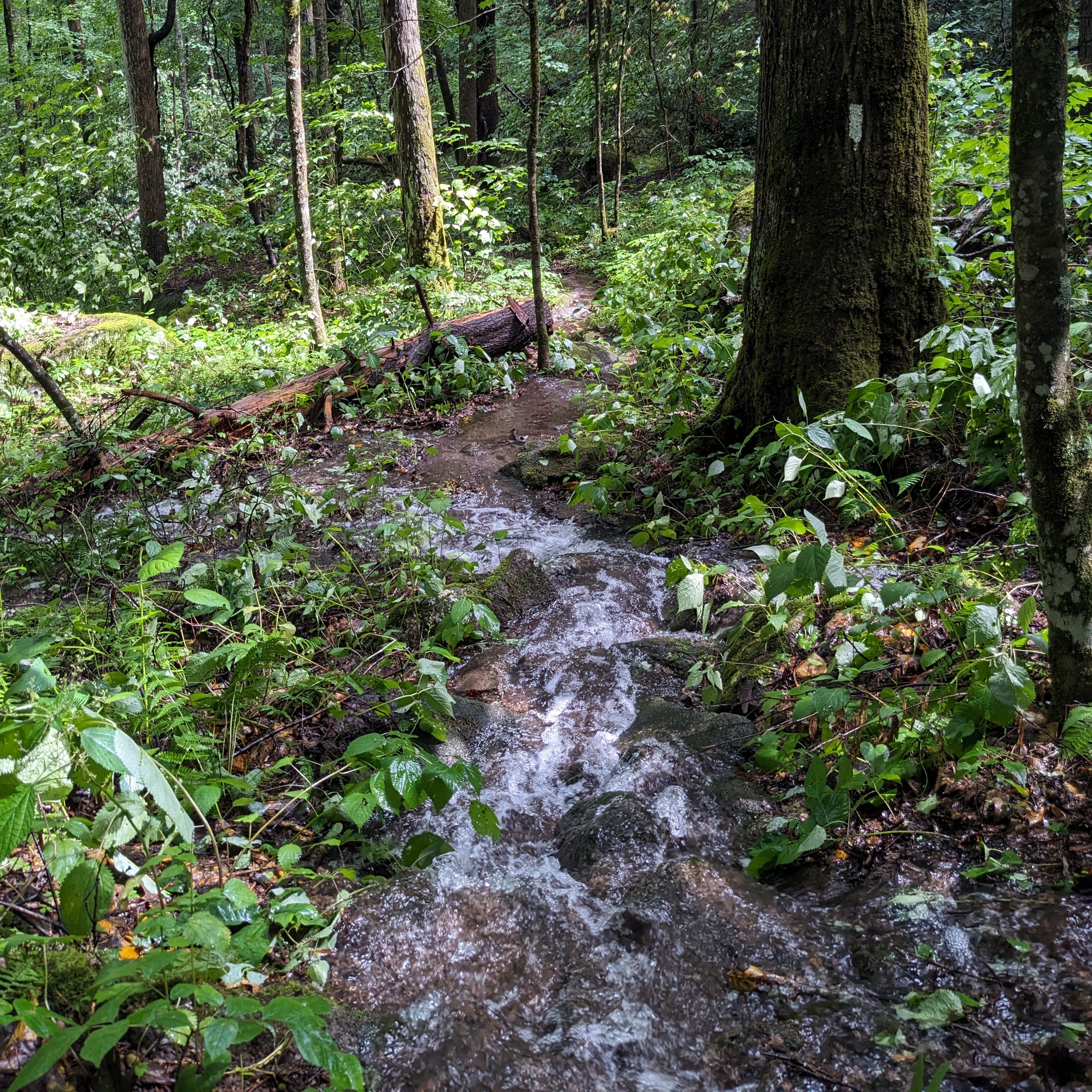 I continued slowly making my way down the trail. There were no more big swaths of blowdown, just many, many individual fallen trees on the trail. I descended into a valley where rainwater was still running off the mountains. If it weren’t for the white blazes, I would have thought the AT was a creek!