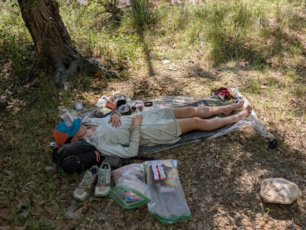 The trail followed a creek for about 6 miles, which was great because it provided lots of opportunities to dip my dress and hat in the water to stay cool. By 12 pm, we parked ourselves in the shade at the final creek crossing and settled in for another great siesta.