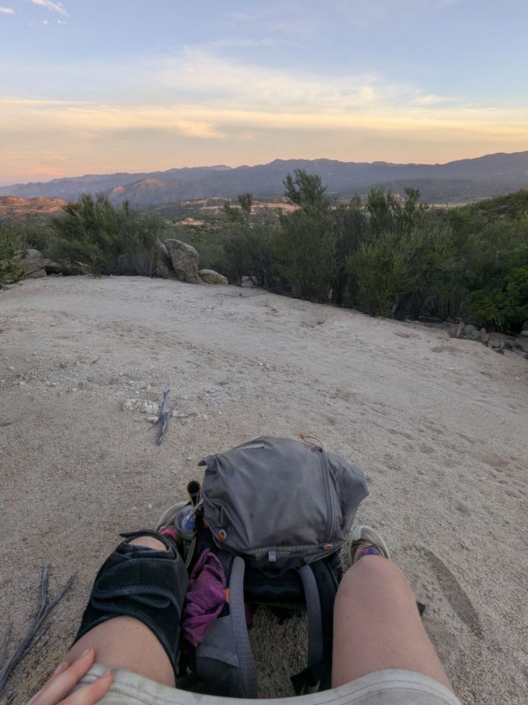 After the siesta, we hiked another 12 miles or so, climbing gradually as the sunset. It was late and dark out when we arrived at the next water source, a cistron 0.2 miles off the trail. We ate dinner there, filled all our water containers, and continued a short distance on the trail to dry camp – which means camp away from a water source, relying on carried water only for eating, drinking, and washing.