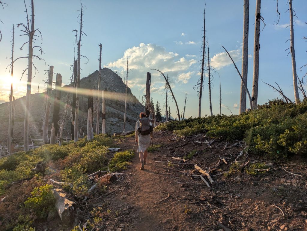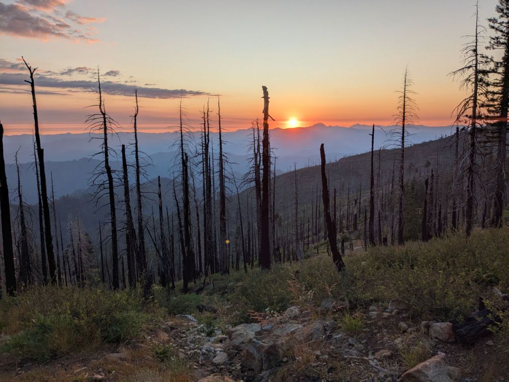 I reached my planned campsite around 8 pm – a beautiful spot on a grassy ridge. However, there was still an hour of daylight left and I felt pretty good. I decided to push on and enjoy hiking. The sunset was especially beautiful tonight – bright red due to the smoke in the air from the nearby wildfires.