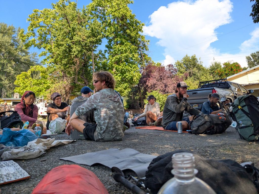 Thru-hikers loitering in a shady spot in the restaurant parking lot on Seiad Valley.
