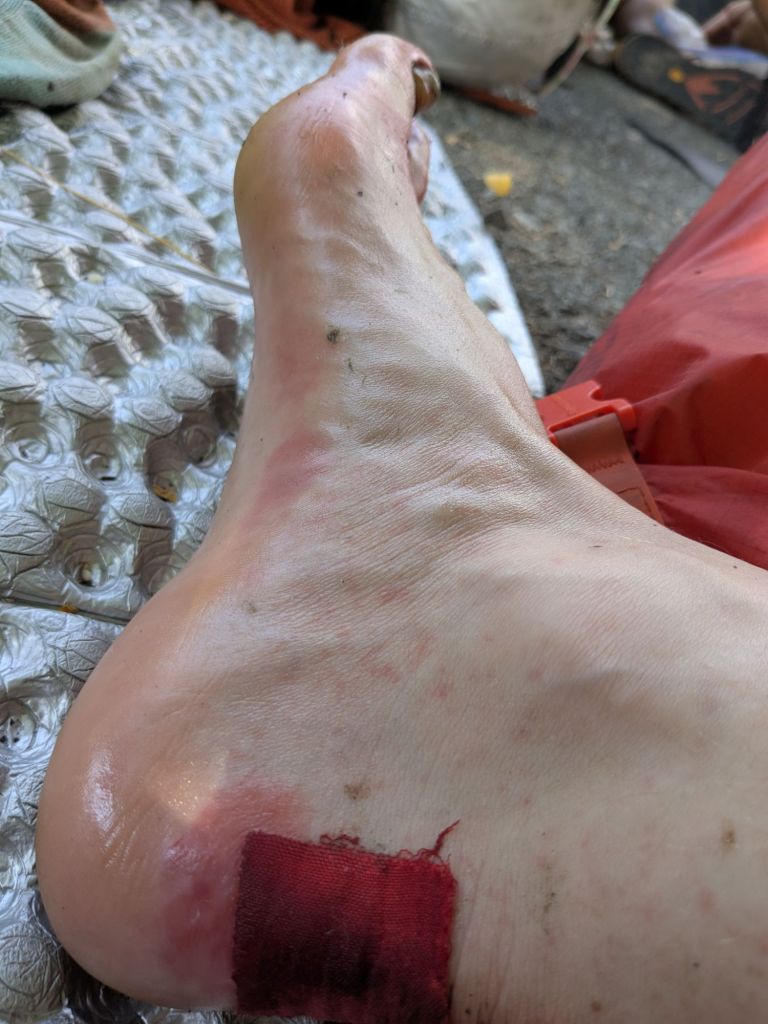 My feet are covered in a painful mixture of heat rash and chaffing from my socks. After walking through many burn areas in NorCal, my socks are caked with dust, ash, and salt. Even after washing and rinsing them, they never get clean. They are roughly the texture of sandpaper and stiff as boards on the rare occasions that they are completely dry. Usually, they are sweaty from my feet. Each day without laundry, it grows increasingly painful to walk in these crusty torture devices.