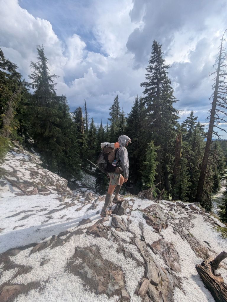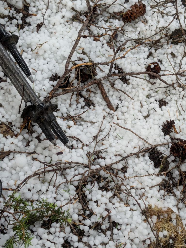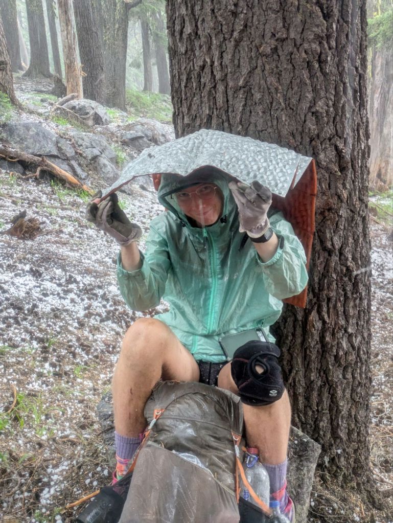 As I waited, the rain turned to little lentil-sized hail… Then pea-sized. Then grape-sized! As the hail intensified, I pulled out my foam sleeping pad and held it over my head for some protection.