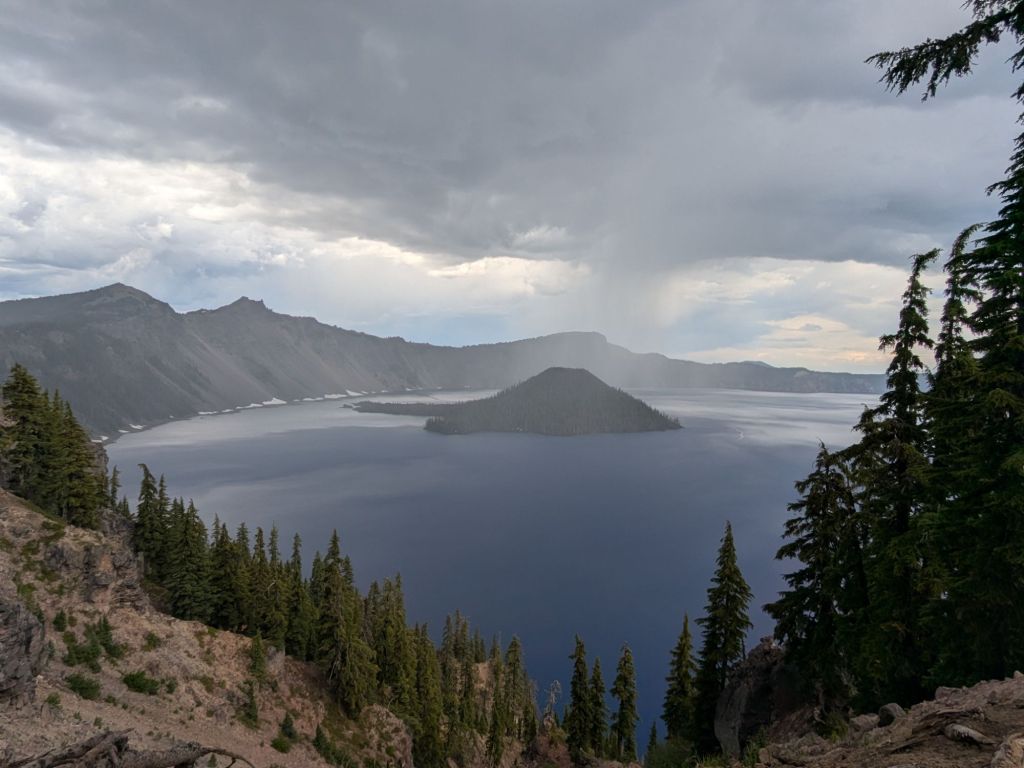 After a brief stop at the lodge for a lemonade, I shouldered my pack and started the long walk along the rim of the Crater to reconnect to the PCT. As soon as I started walking, a light rain began. I warily continued on, keeping an eye on the thunder and lightning situation.