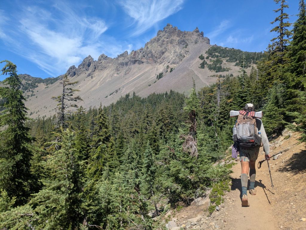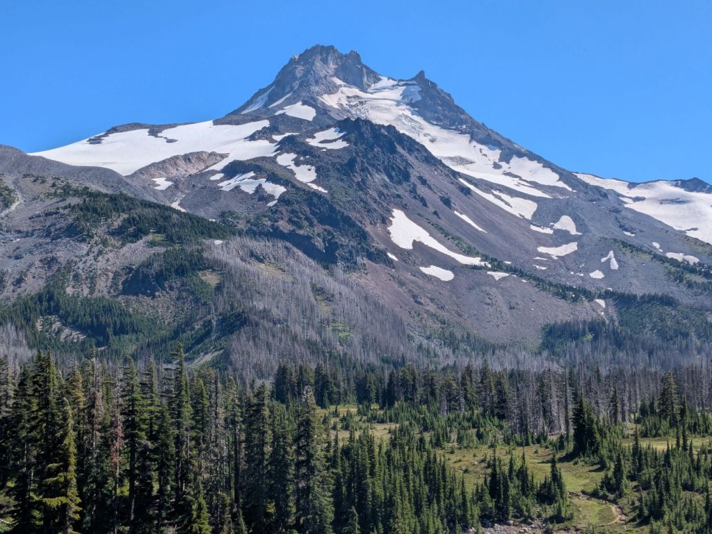 Between MacKenzie Pass and Timberline Lodge, the Pacific Crest Trail skirts around the edges of several large volcanoes. First, Three Finger Jack, then Mount Jefferson, and finally Mount Hood. These mountains feature dark volcanic rocks, spiky peaks, and large, semi-permanent snowfields.