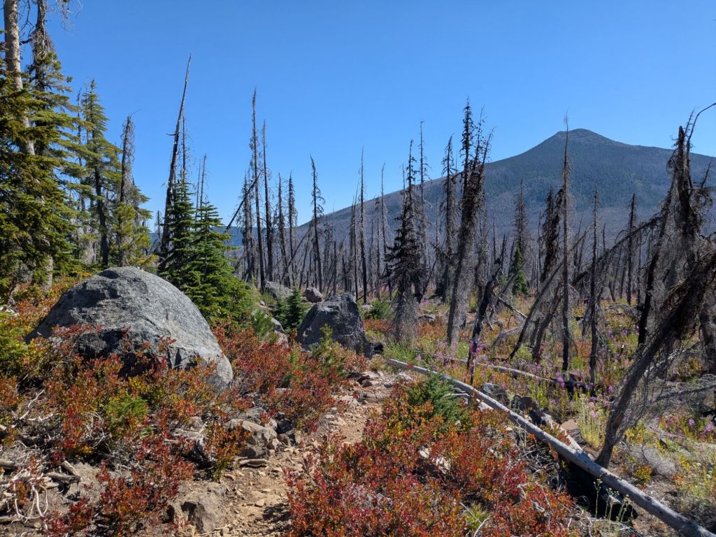 Eventually, the trail wound around the left side of Mount Jefferson. A lot of this area was burnt. Once again, I found myself walking with no shade on a hot day – giving me flashbacks to NorCal.