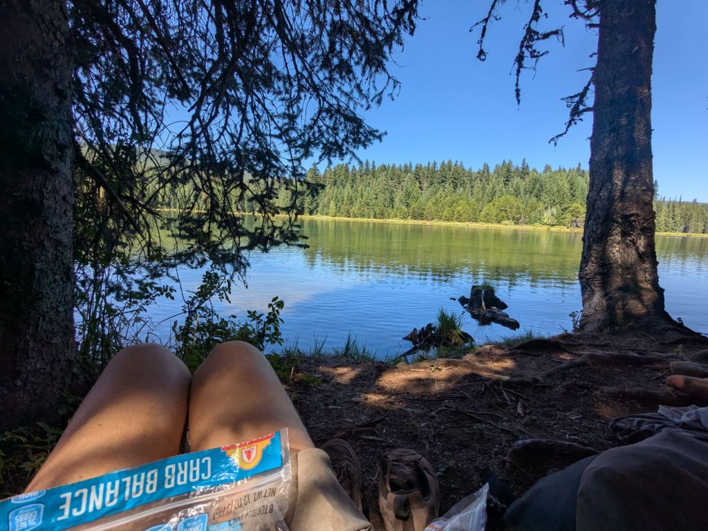 I made up for the frustrations of the morning by taking my sweet time eating breakfast and packing up camp. I hit the trail at 9 am and busted out a quick 11 miles to reach a huge lake just after noon. There, I took an extra-long break and enjoyed swimming and catching up on writing in the shade.