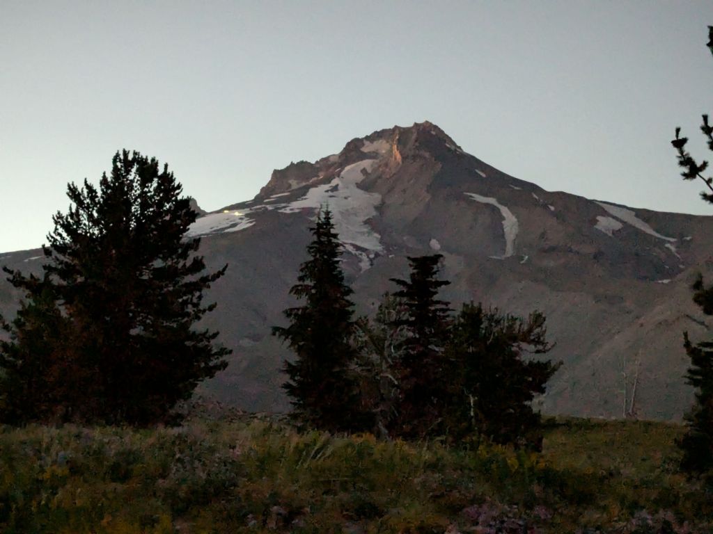 In the evening before camp, I stopped and filled my cold soak jar with huckleberries picked from the many bushes lining the trail. Shortly after, the trees gave way to sandy, open slopes on the shoulder of Mount Hood. Here, I made my camp, beneath the view of the colossal volcano. As I dozed off under the stars, tucked in my quilt to protect me from the whipping wind, I watched the Perseids meteor shower. I was tired enough that I only saw 5 shooting stars before I fell asleep.