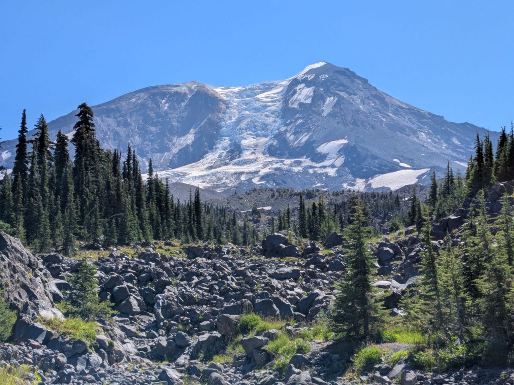 In addition to views of Mt Adams, I got my first glimpses of Mt Rainer today. Both mountains have lots of snow, and even glaciers on them. On the trail below Adams, I saw plenty of evidence of more widespread glacial activity in the past – including wide fields of glacial till and moraines. The creeks ran whitish – though this could be due to the glaciers or the burn area I suppose.