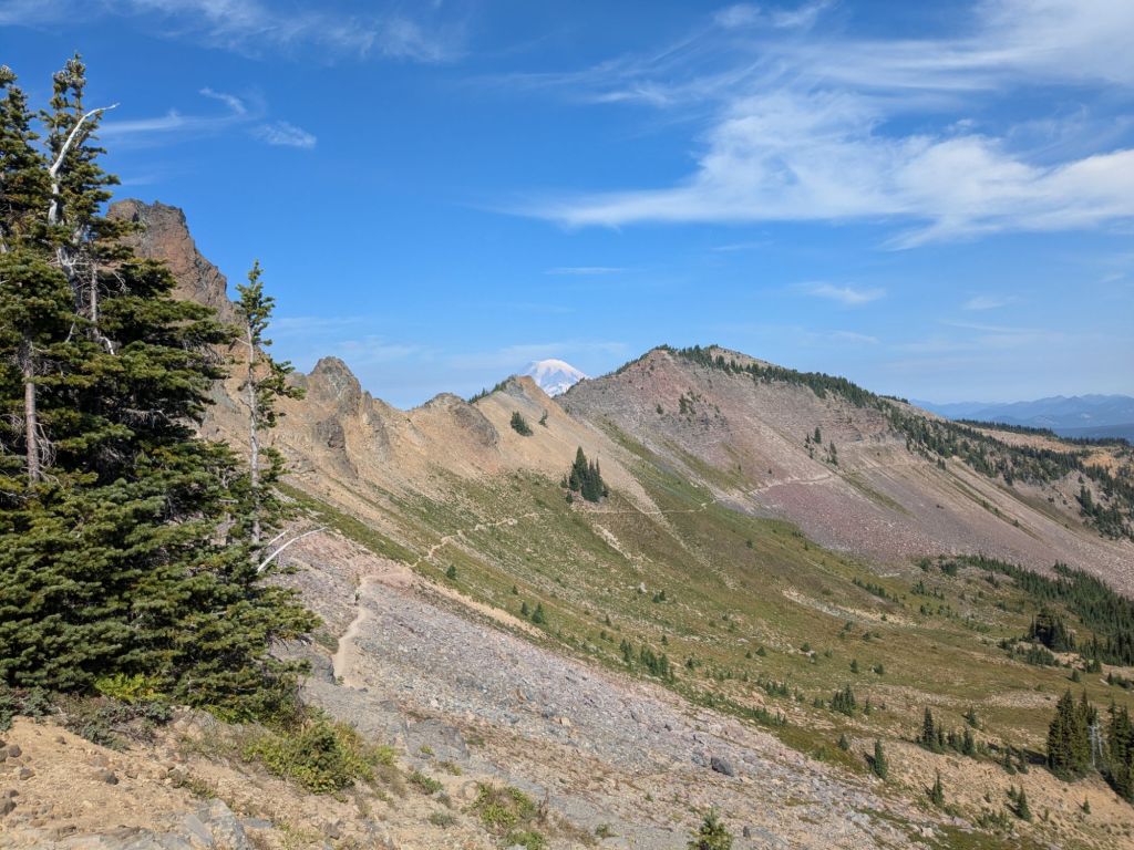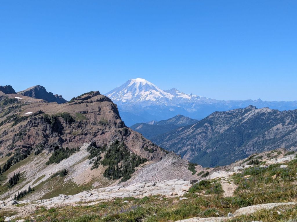 The beautiful views continued this morning! After a steep climb uphill from where I camped, I crested a small pass with views back to the ridge I walked on yesterday. The views of Mt Rainier are also getting better, as I hike closer and closer to it. The PCT doesn’t actually get particularly near to Mt Rainier. But it is such a large mountain that it looks huge on the horizon.
