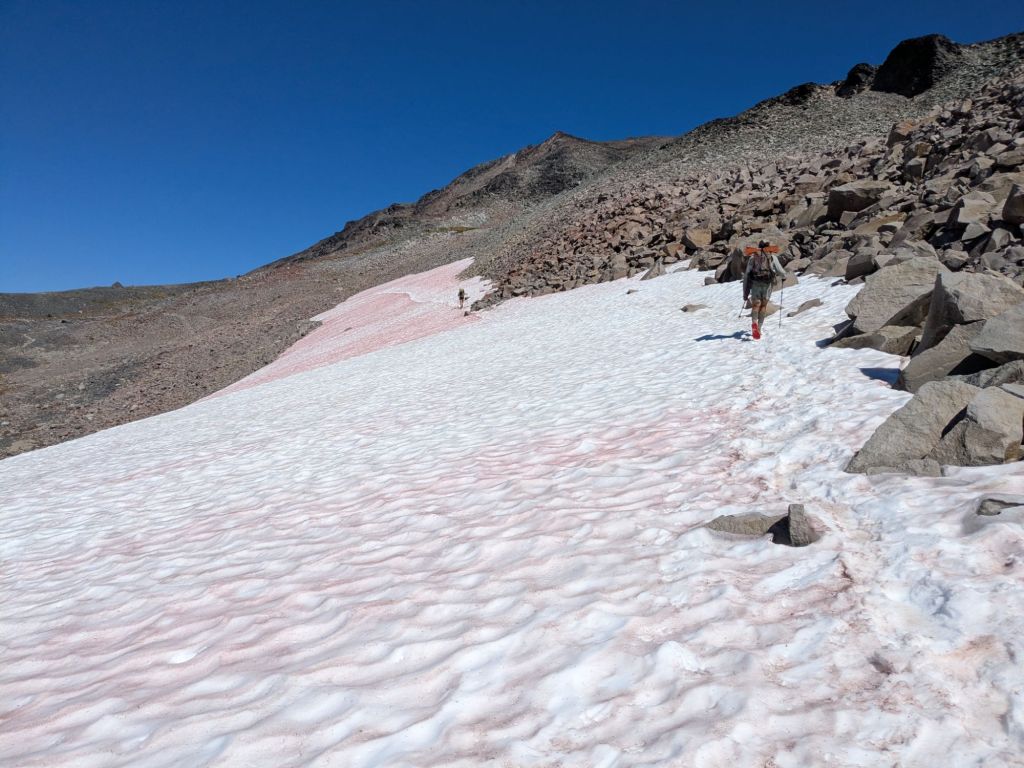 Hikers crossing a snowfield in the Goat Rocks Wilderness in August, near 7,000 feet above sea level.