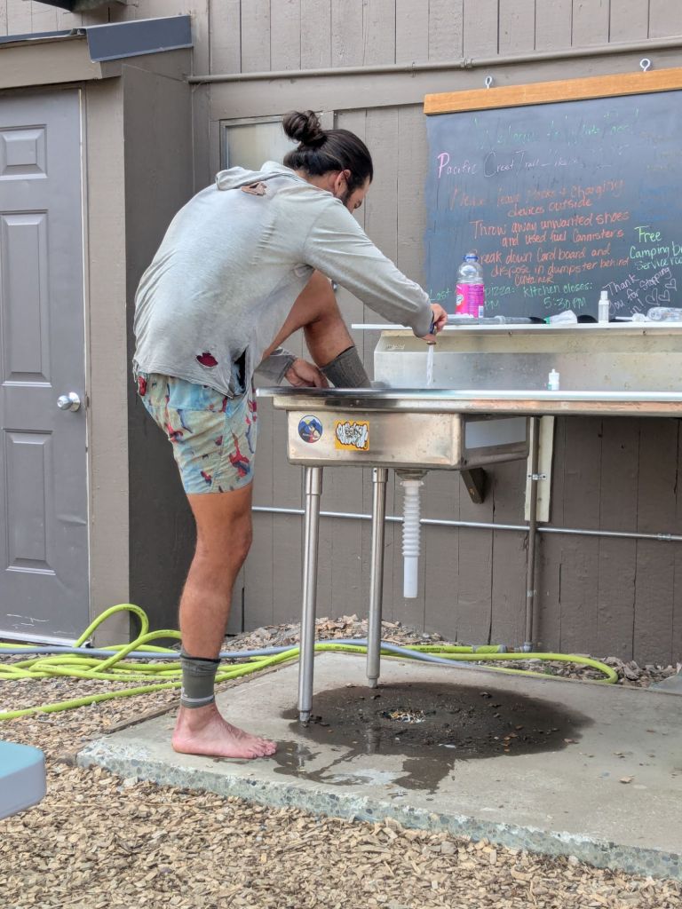 When I arrived, I was pleasantly surprised to find a hiker hangout area around the back of the store, complete with picnic tables, awnings, a charging station, a sink, and a hiker box. They even offer laundry and showers for the price of $10 each. I skipped the pricey shower and laundry and simply hand-washed my socks and underwear in the sink.