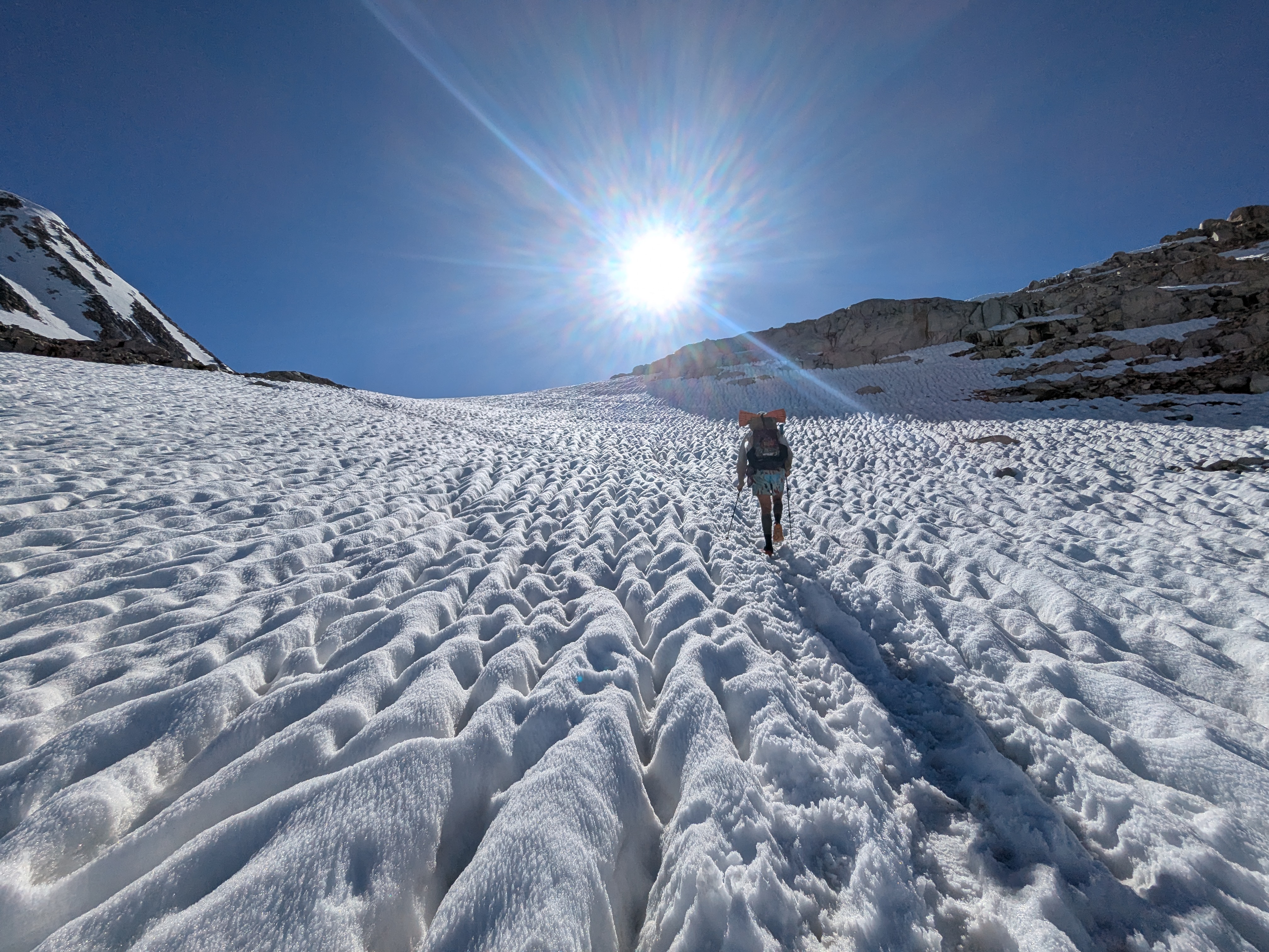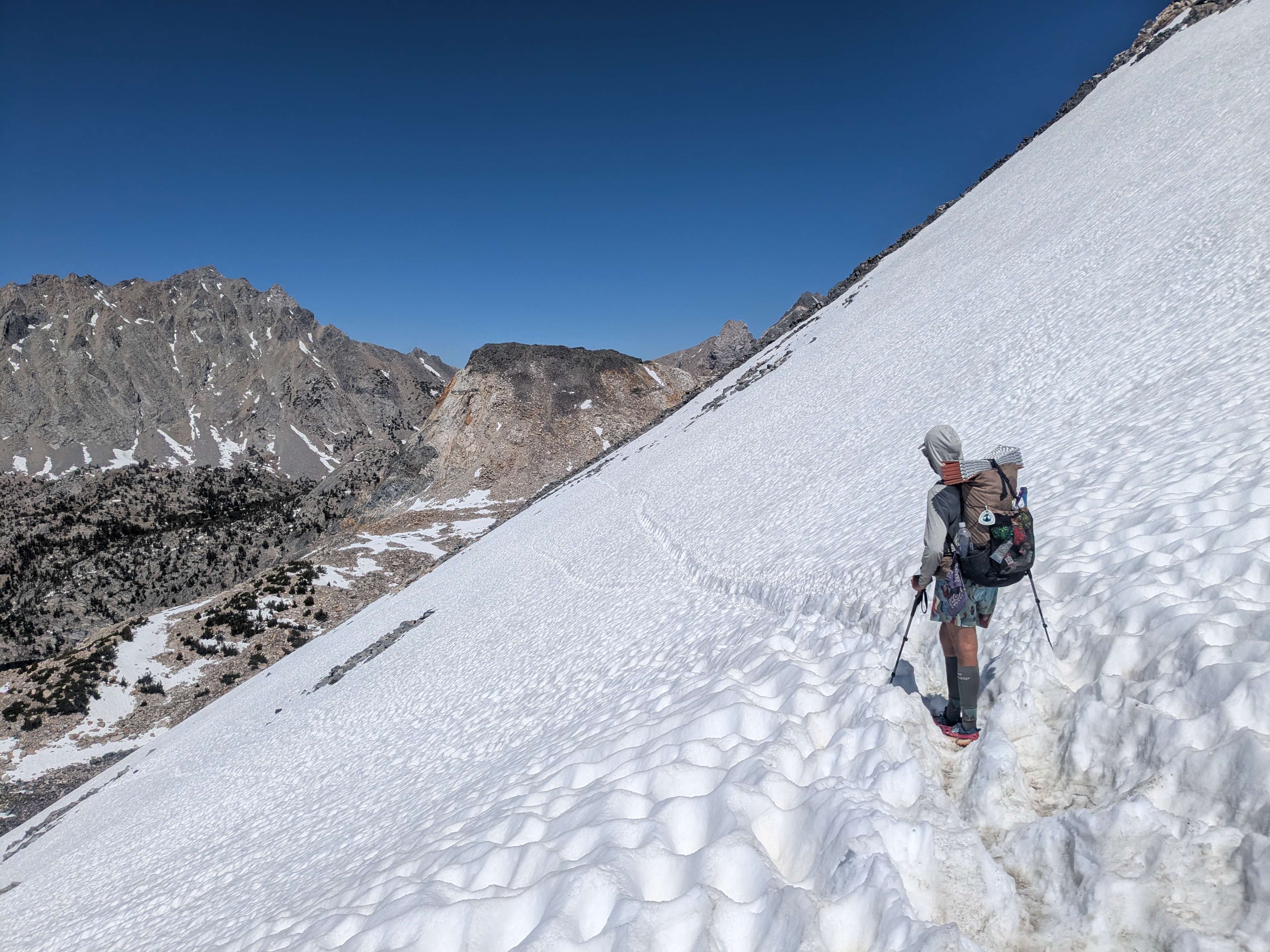 I got into a rhythm hiking passes in the late afternoon. In this, I deviated from the popular schedule of hitting passes early in the day. Many hikers feel that the passes are easier when the snow is hard and icy in the early-morning low temperatures. They camp right before a pass, rise early, hit the pass, hike down, set up camp before the next pass, and then go to bed early.
