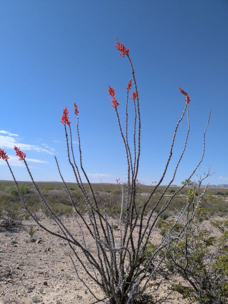 Ocotillo is a desert plant that, for much of the year, looks like a bundle of dead, thorny, brown sticks. But after rainy times in spring, they sprout a coating of little green leaves and striking red flowers at their tips.