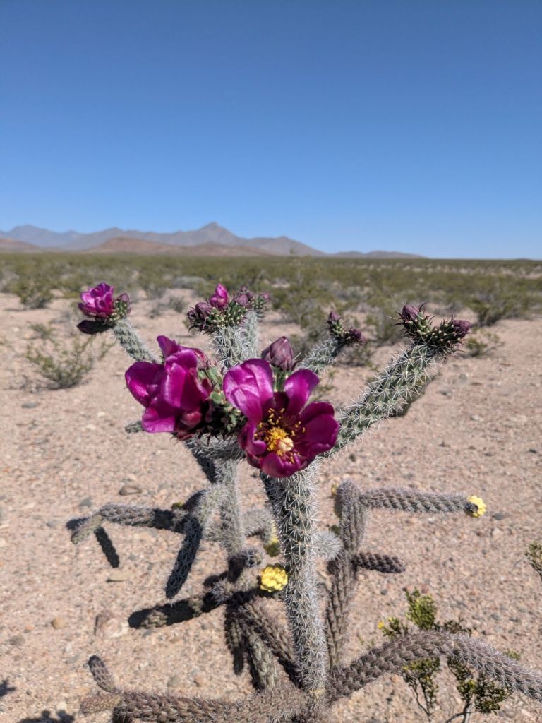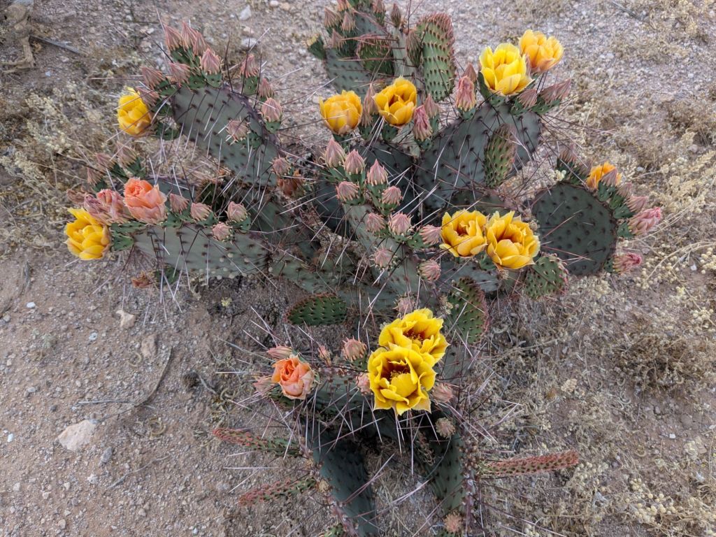 The best surprise of all today was that the desert is currently in bloom. I saw little yellow creosote blossoms. Big fuchsia flowers on the cholla. Clusters of golden prickly pear blossoms. And best of all, the ocotillo is flowering.