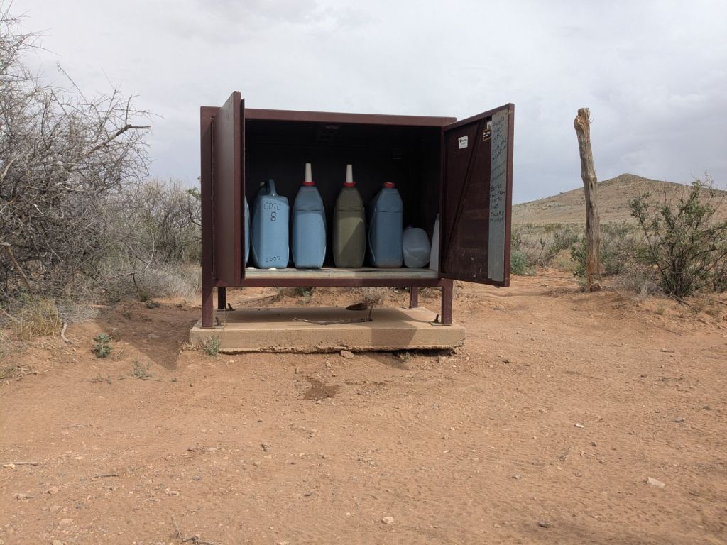In the early afternoon, I reached my first water source on the CDT. This isn’t a natural water source. It’s a water cache that the CDTC maintains. There are CDTC caches here and there throughout the first 80 miles of the trail. This one is a big metal box with several water jugs inside.