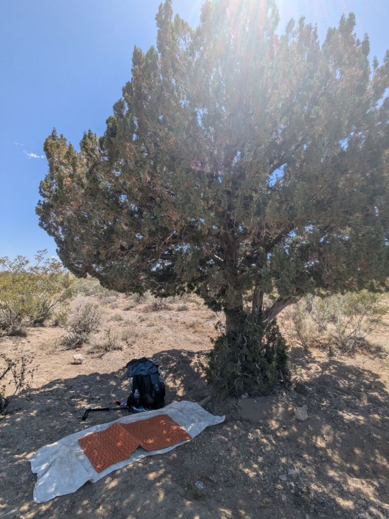 Shortly past the water, I spotted a lone tree not far off the trail. Seizing this rare opportunity for shade, plopped down under it for a long break during the hottest part of the day. I treated my water, ate, aired out my sweaty feet, and did a little writing.