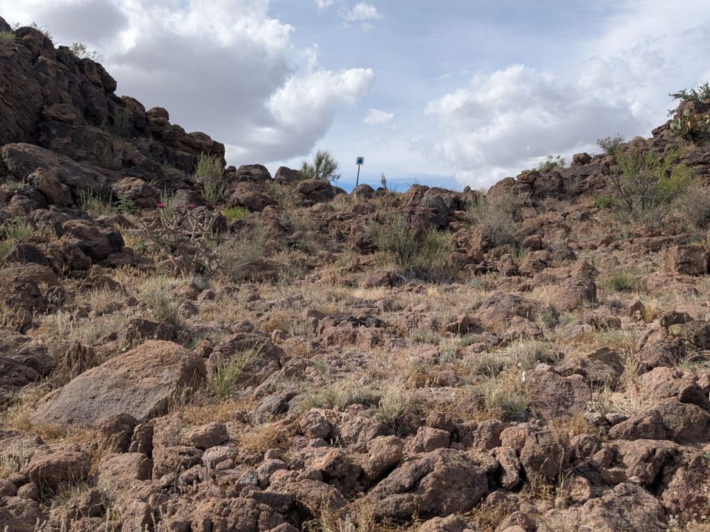 I started hiking once it cooled off and some clouds rolled in, around 4 pm. The trail made its way across the rest of the flat bit to some nearby hills. Surprisingly, these hills are all made from a bubbly, reddish volcanic rock.