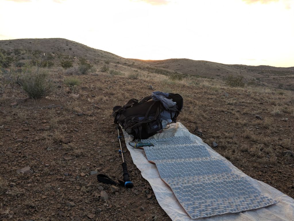 I carried on only a short way past the water cache by myself looking for a campsite. I found one atop a little hill that was too pretty to pass up. However, as soon as I set up my cowboy camp, the wind whipped up and it started sprinkling. Annoyed, I pitched my tarp, struggling to hammer my stakes into the rocky soil.